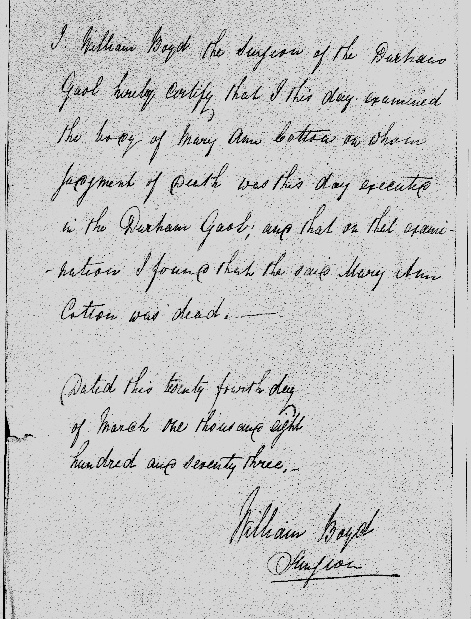 I William Boyd the surgeon of the Durham Gaol (Jail) hereby certify that I this day examined the body of Mary Ann Cotton, on whom judgement of Death was this day executed in the Durham Gaol; and that on that examination I found that the said Mary Ann Cotton was Dead.